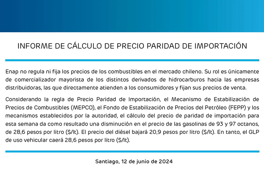 Este miércoles 12 de junio, la Empresa Nacional del Petróleo (ENAP) anunció una esperada reducción en el precio de las bencinas y demás combustibles a partir del jueves 13 de junio.