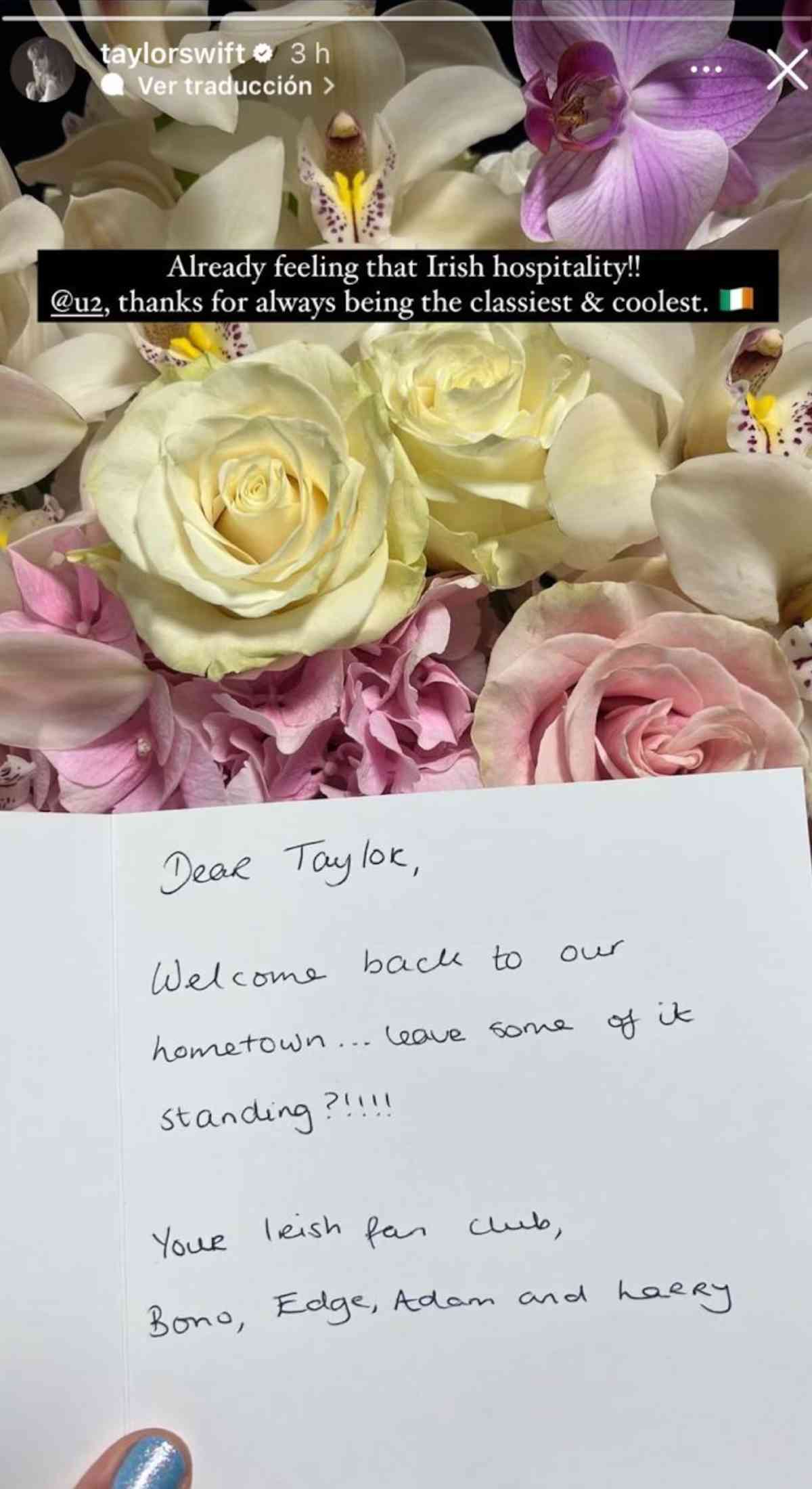 A través de sus redes sociales, la cantante de Shake it Off mostró un ramo de flores que le enviaron Bono, Edge, Adam, y Larry, acompañadas de una tarjeta que decía: "Querida Taylor: Bienvenida de nuevo a nuestra ciudad natal... ¡dejá algo en pie! Tu club de fans irlandés: Bono, Edge, Adam y Larry".