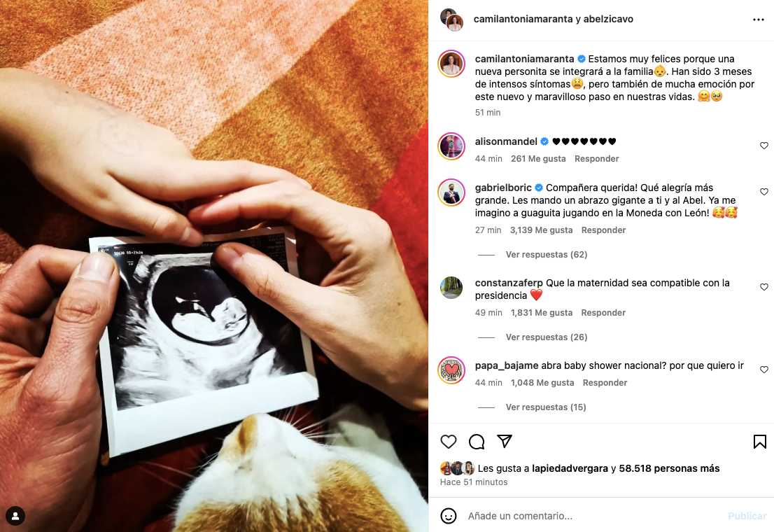 El anuncio también recibió un cálido mensaje del Presidente Gabriel Boric, quien comentó en la publicación: "¡Compañera querida! Qué alegría más grande. Les mando un abrazo gigante a ti y al Abel. Ya me imagino a guaguita jugando en La Moneda con León!".