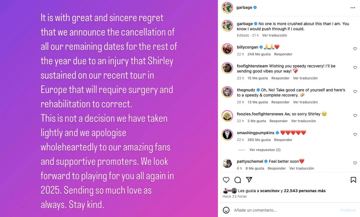 "Con gran pesar anunciamos la cancelación de todas nuestras fechas restantes para el resto del año debido a una lesión que Shirley sufrió en nuestra reciente gira por Europa que requerirá cirugía y rehabilitación para corregir", compartió la banda en un mensaje publicado en Instagram.