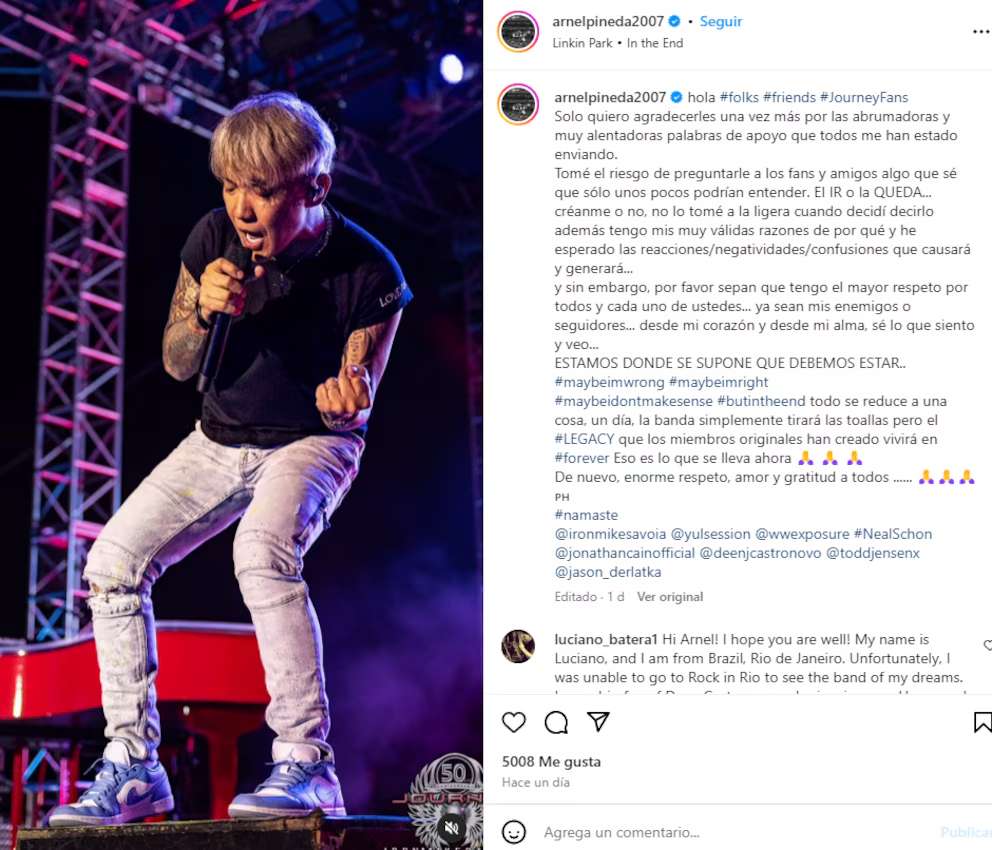 El cantante filipino Arnel Pineda, vocalista de Journey desde 2007, rompió su silencio tras la controversia generada por su reciente oferta de abandonar la banda si un millón de fanáticos votaban a favor de su salida.