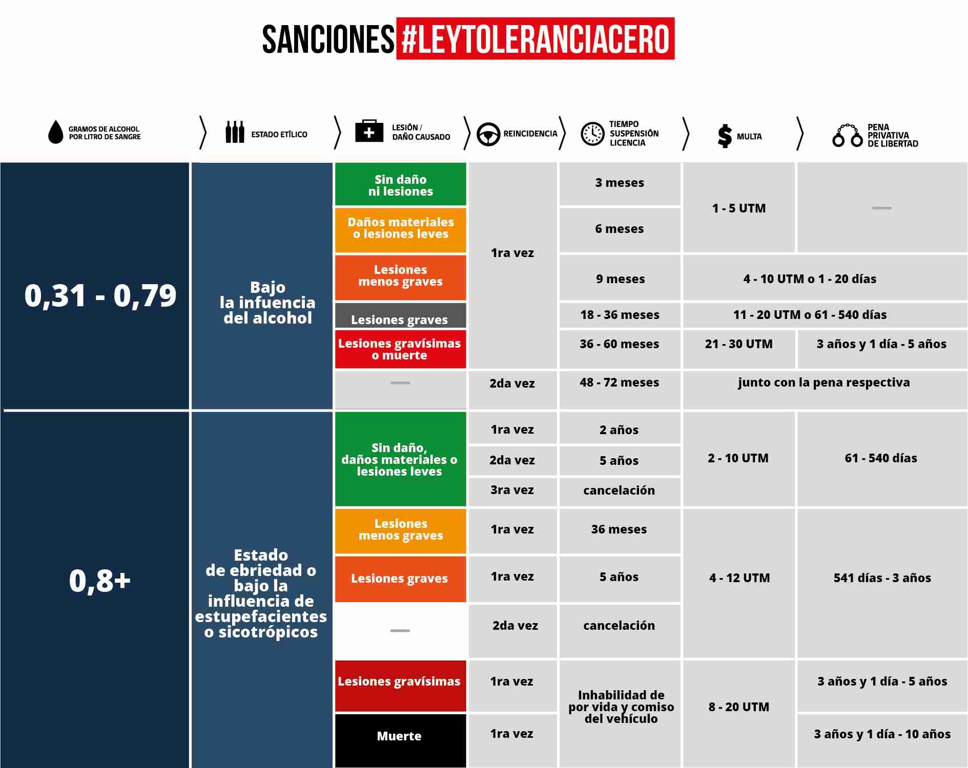 La Ley Tolerancia Cero aumentó las sanciones para la suspensión de la licencia, dependiendo de la infracción que se cometa y las consecuencias que ésta tenga.