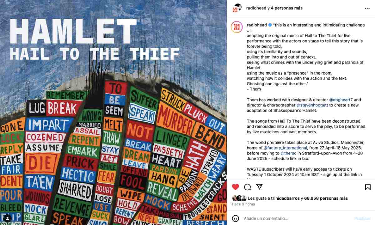 Radiohead anunció a través de sus redes sociales un nuevo e intrigante proyecto. Su líder, Thom Yorke, trabajó en una adaptación de su álbum Hail To The Thief (2003) para convertirlo en la banda sonora de una versión teatral de Hamlet, dirigida por Christine Jones y Steven Hogget.