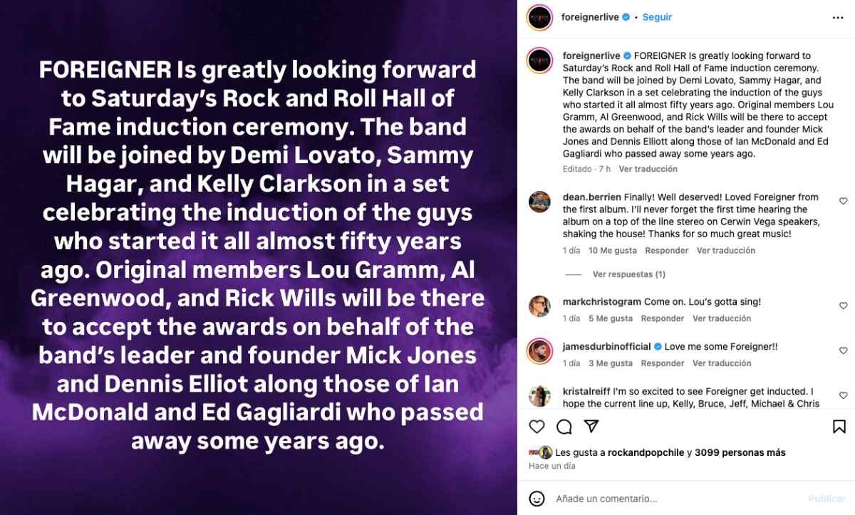 En un comunicado publicado en Instagram, la banda expresó: "Foreigner espera con ansias la ceremonia de inducción al Rock & Roll Hall of Fame este sábado".