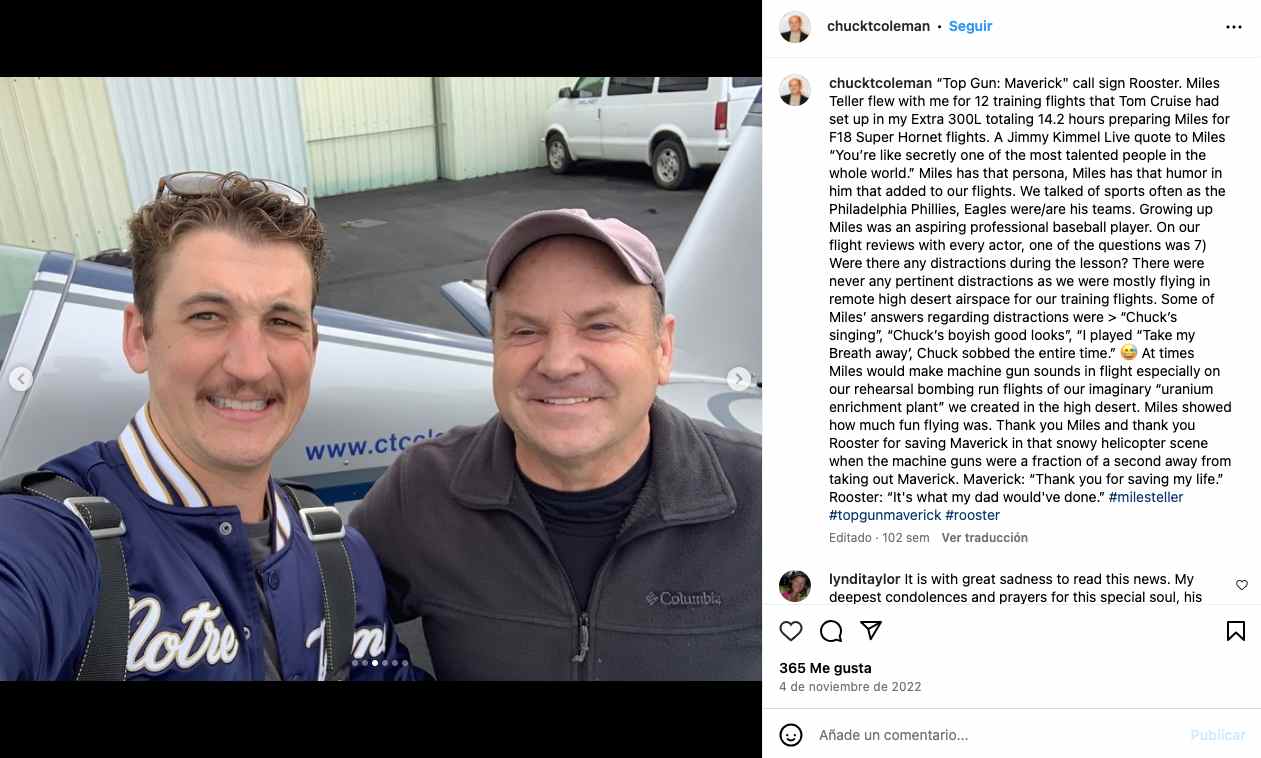 Glen Powell, quien también fue entrenado por Coleman, destacó la dedicación del piloto: "Aprendimos a volar de verdad, y eso se lo debemos a Chuck. Era un maestro del aire", declaró a CBS tras conocer la noticia de su muerte.