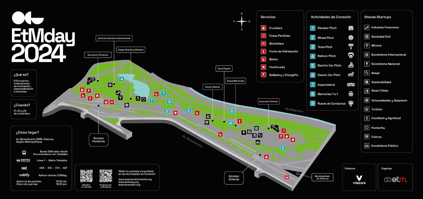 - Hay dos accesos al Etmday, ambos por Avenida Bicentenario (siendo la principal, el acceso Oriente, más cerca de la Municipalidad de Vitacura, y Poniente, hacia el otro costado del parque), donde habrá puntos de acreditación.