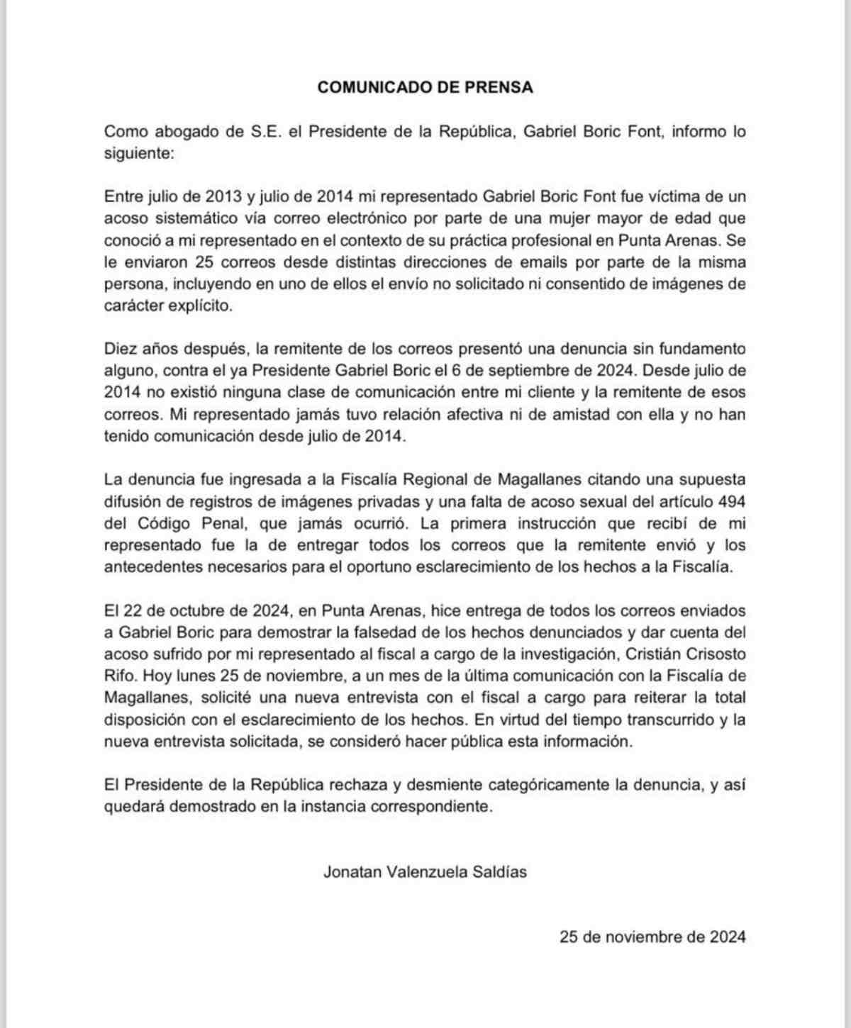 En su comunicado, enfatizó que el Presidente Gabriel Boric rechaza categóricamente las acusaciones. Asimismo, confía en que quedará demostrado que los hechos denunciados no corresponden a la realidad.
