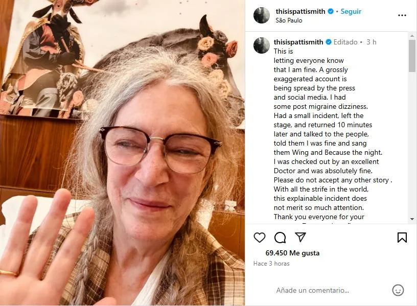 La icónica poeta punk Patti Smith salió a despejar rumores sobre su estado de salud tras un incidente durante su concierto en São Paulo, Brasil, el pasado 29 de enero. Videos compartidos en redes sociales mostraban a la artista de 78 años actuando en una silla de ruedas después de haber sufrido un desmayo en el escenario, lo que desató especulaciones sobre su bienestar.