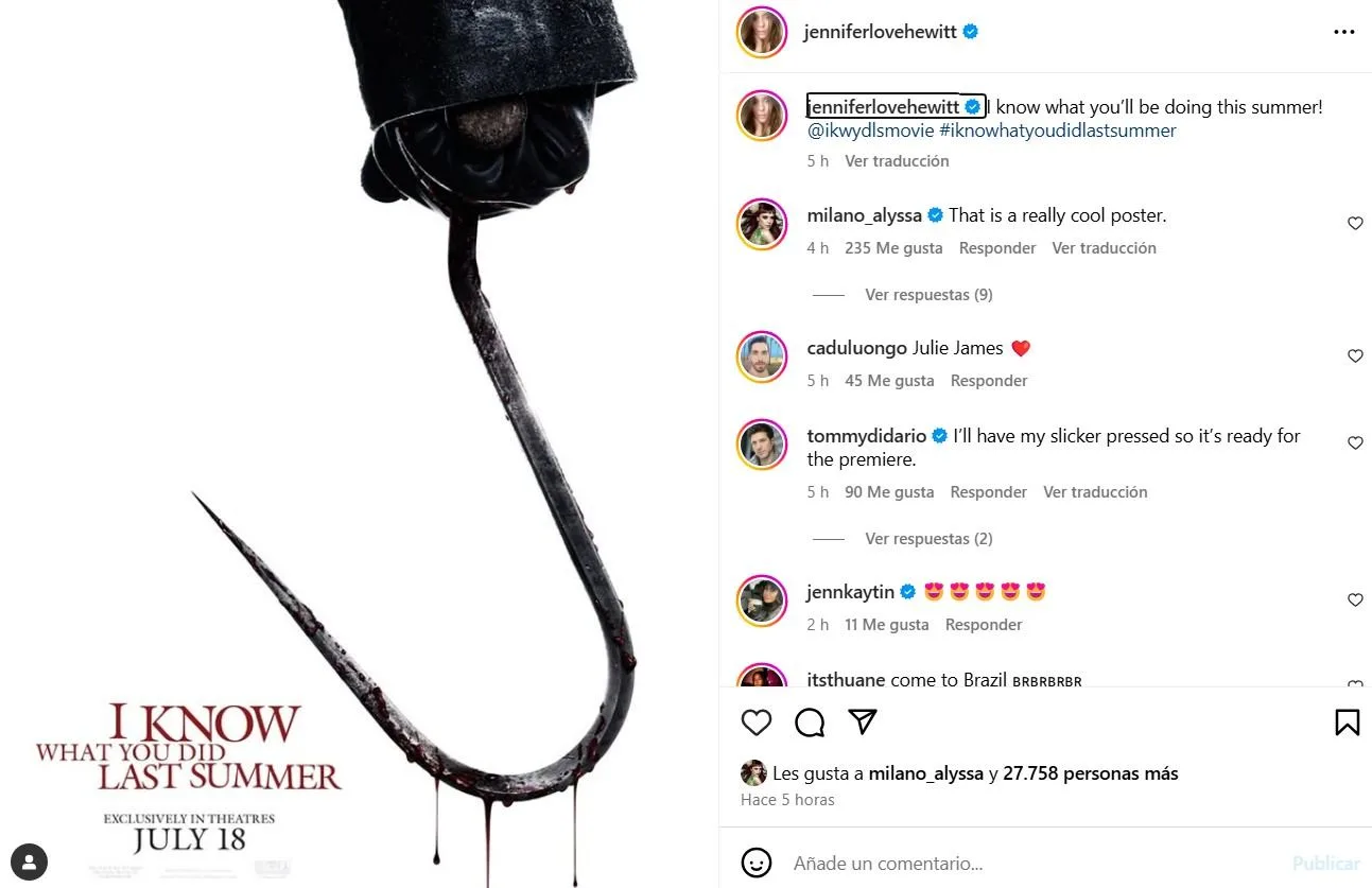 "Nunca es tarde para volver. Julie James está regresando. ¡Sé lo que harás el próximo verano!", escribió Hewitt en Instagram al confirmar su regreso a la franquicia.