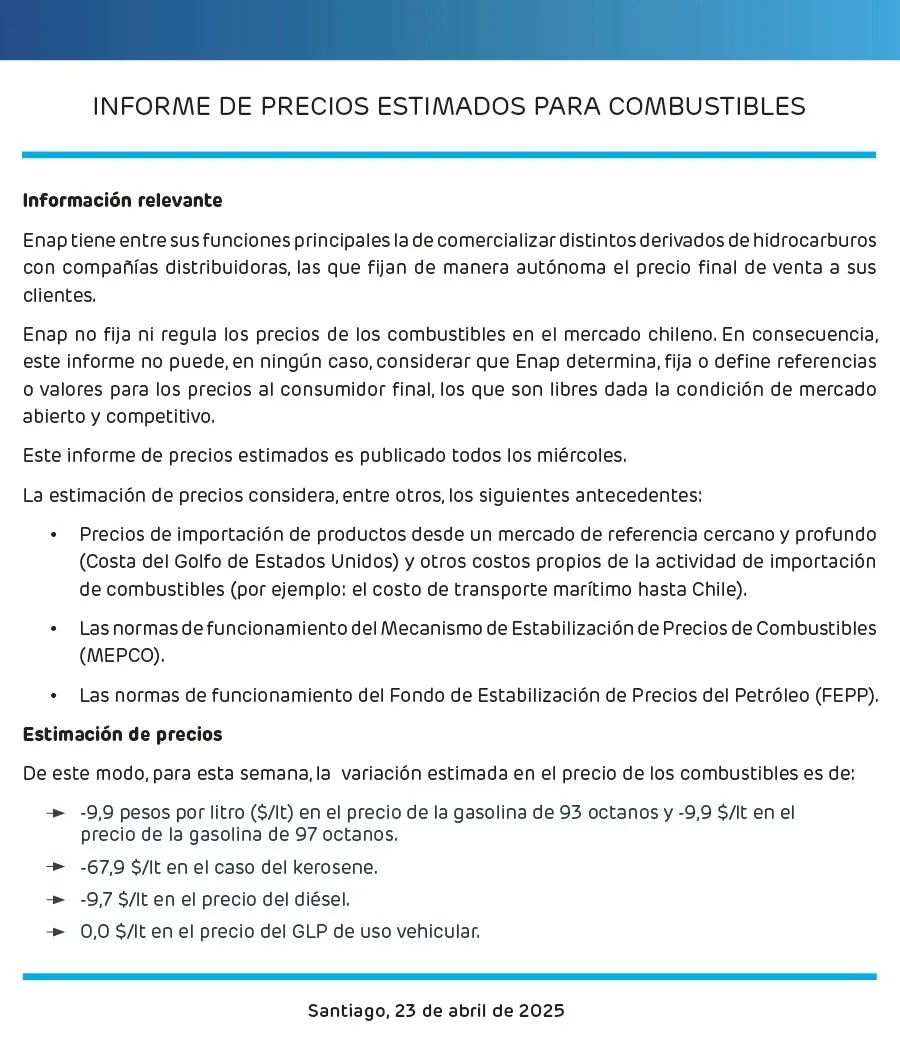 La Empresa Nacional del Petróleo (ENAP) comunicó este miércoles los nuevos ajustes en el precio de la bencina y demás combustibles que se aplicarán en Chile a partir de mañana, jueves 24 de abril de 2025.