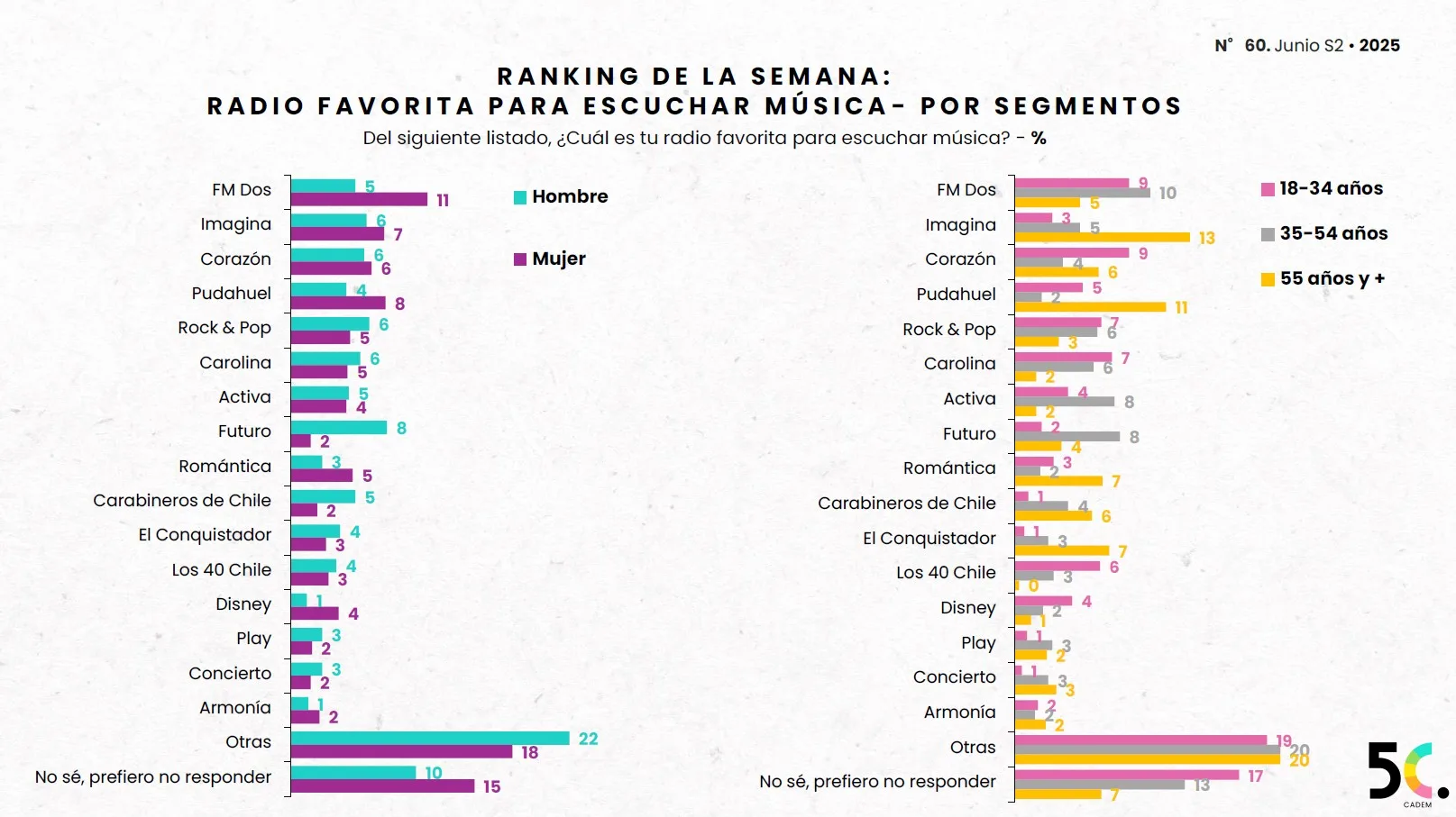 Además, otras emisoras del grupo como Imagina, Corazón, Pudahuel, Rock & Pop, Radioactiva, LOS40 y Concierto también figuran con fuerza en el ranking, sumando un total de nueve radios del holding entre las preferencias más mencionadas por los encuestados.