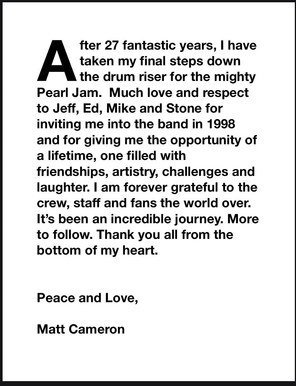 “Después de 27 años fantásticos, he dado mis últimos pasos tras la batería de la poderosa Pearl Jam. Mucho amor y respeto a Jeff, Ed, Mike y Stone por invitarme a la banda en 1998 y brindarme la oportunidad de mi vida. Estoy eternamente agradecido con el equipo, el staff y los fans alrededor del mundo. Ha sido una experiencia increíble”, escribió Cameron en su mensaje de despedida.
