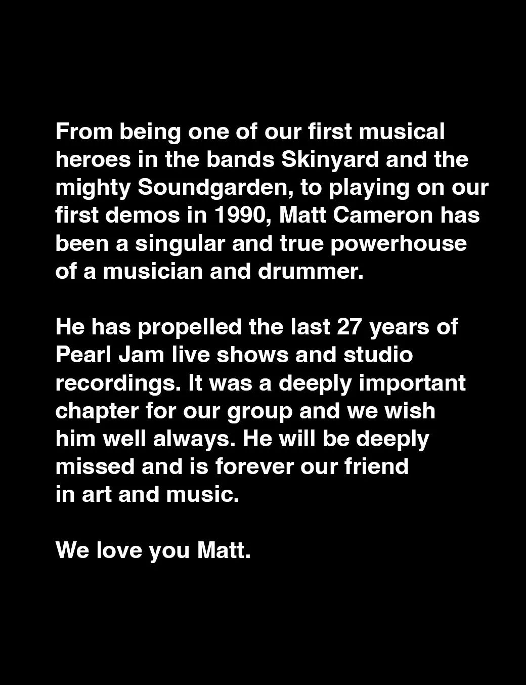 Por su parte, Pearl Jam destacó la trayectoria y el impacto del baterista dentro del grupo: “Desde ser uno de nuestros héroes musicales en Skinyard y Soundgarden, hasta tocar en nuestros primeros demos en 1990, Matt Cameron ha sido un músico excepcional. Fue el motor detrás de nuestros shows y grabaciones durante 27 años. Lo vamos a extrañar profundamente y siempre será nuestro amigo en la música”.